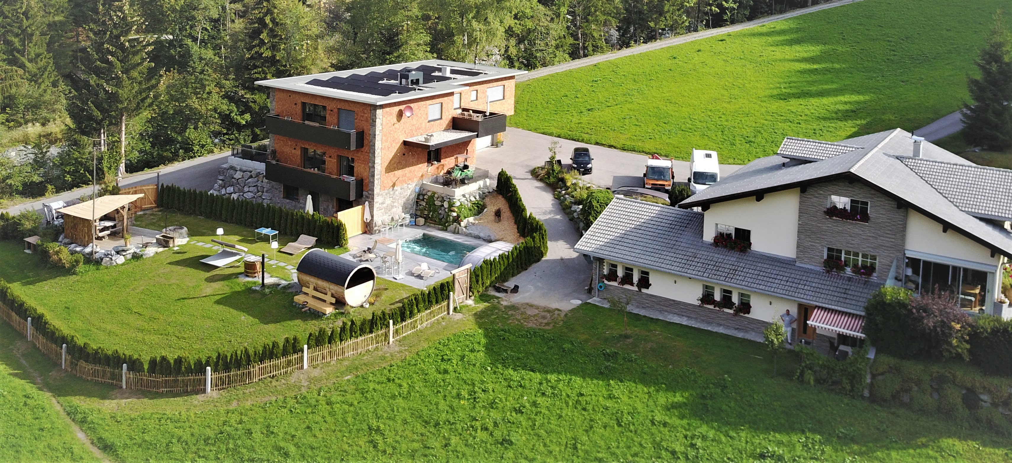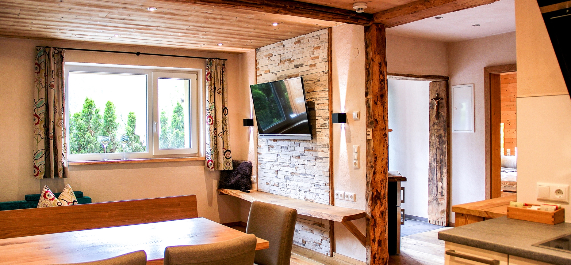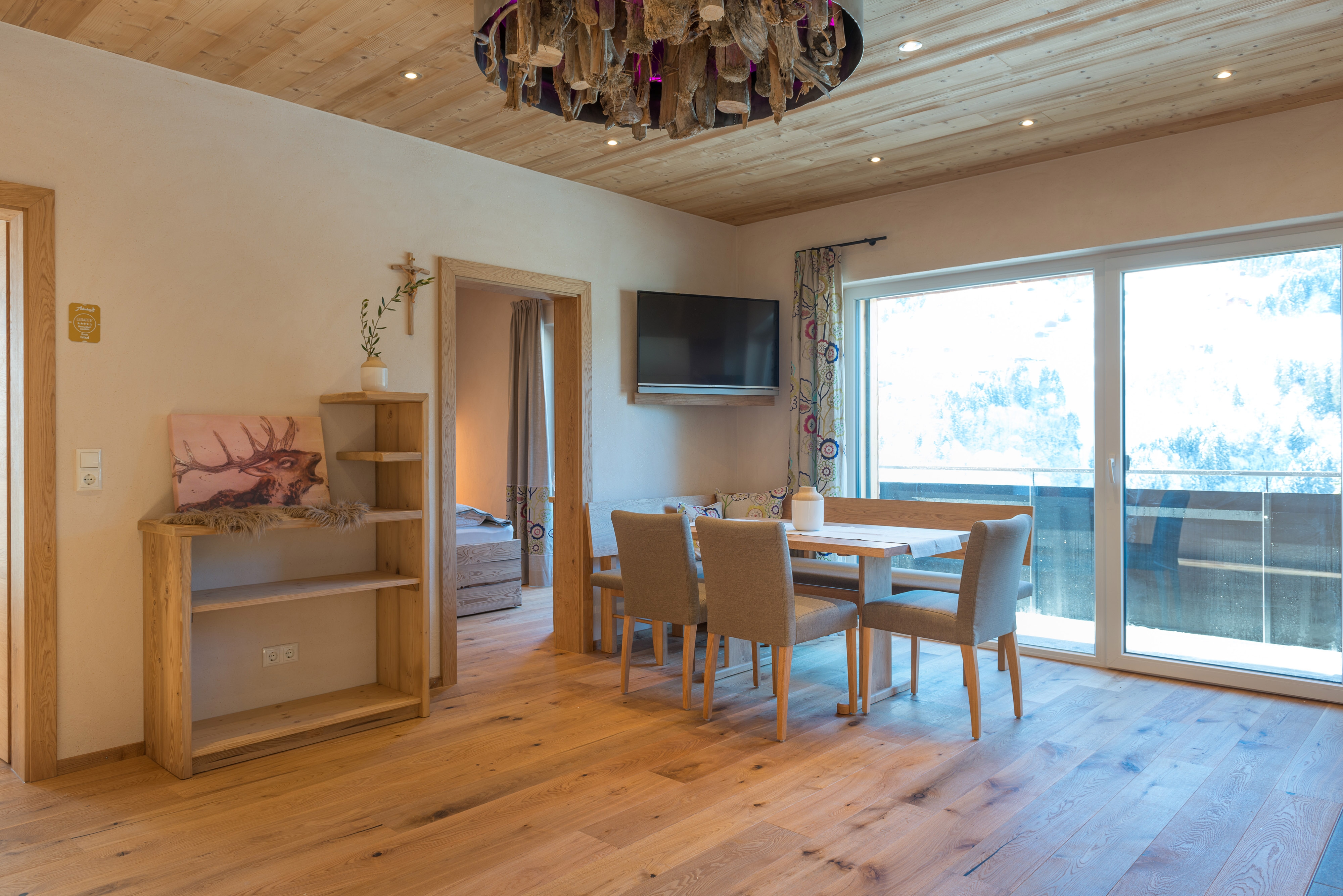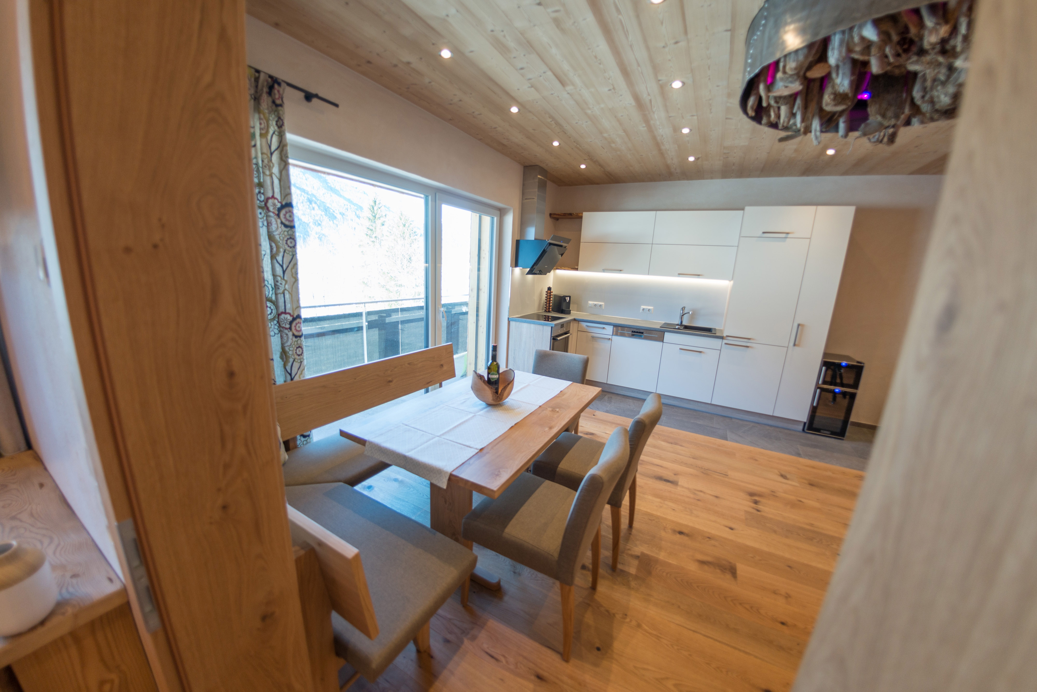 Die Appartements Gizi, Fina und Toni sind dagegen mit jeweils zwei Doppelzimmern ausgestattet. Alle besitzen ein Badezimmer, ein separates WC, einen Balkon beziehungsweise eine Terrasse und eine Küche mit Geschirrspüler, Backofen, Kapselkaffeemaschine und vielen weiteren Extras. Zu ihr gehört auch eine Sitzecke, in der die Gäste ihr Frühstück einnehmen und es sich nach ihren Ausflügen gemütlich machen. Für Skifahrer steht im Chalet ein externer Skiraum mit einer Heizung für die Skischuhe und für Urlauber, die mit dem Auto anreisen, ein Parkplatz zur Verfügung.